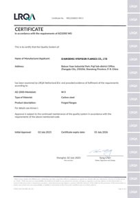 · Certification Body:Lloyd's (LRQA); · Certificate Scope:Manufacturing of Forged Flanges, See annex to certificate; · Certificate No.WEL2568042-W0-1, Issue No. 01; · Certificate Verifying Page:https://www.lrqa.com · See what steel materials have certified